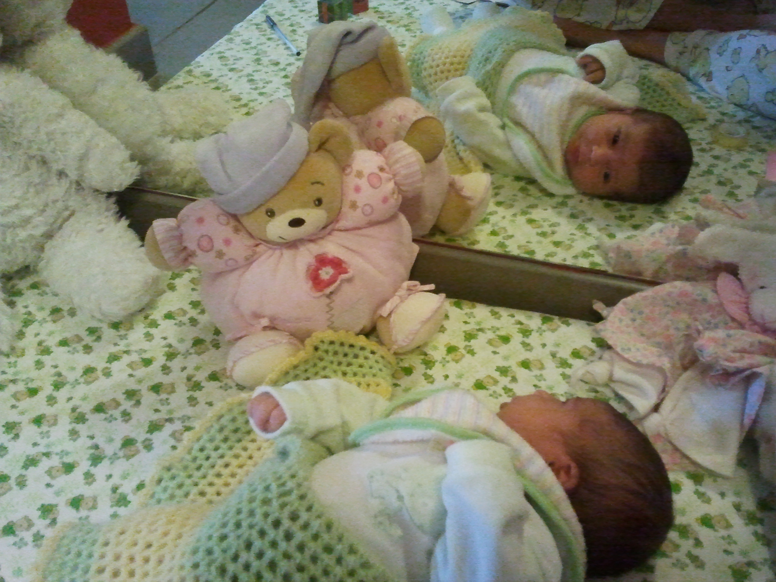 Nina nel suo angolo morbido che inizia a voltare la testa per guardare le immagini riflesse alo specchio..